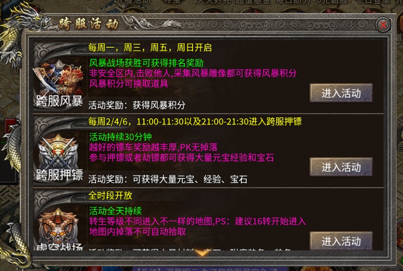 礼包内容:押镖令*10、自动经验卡*1、轮回丹自选包*10、铭文石*50